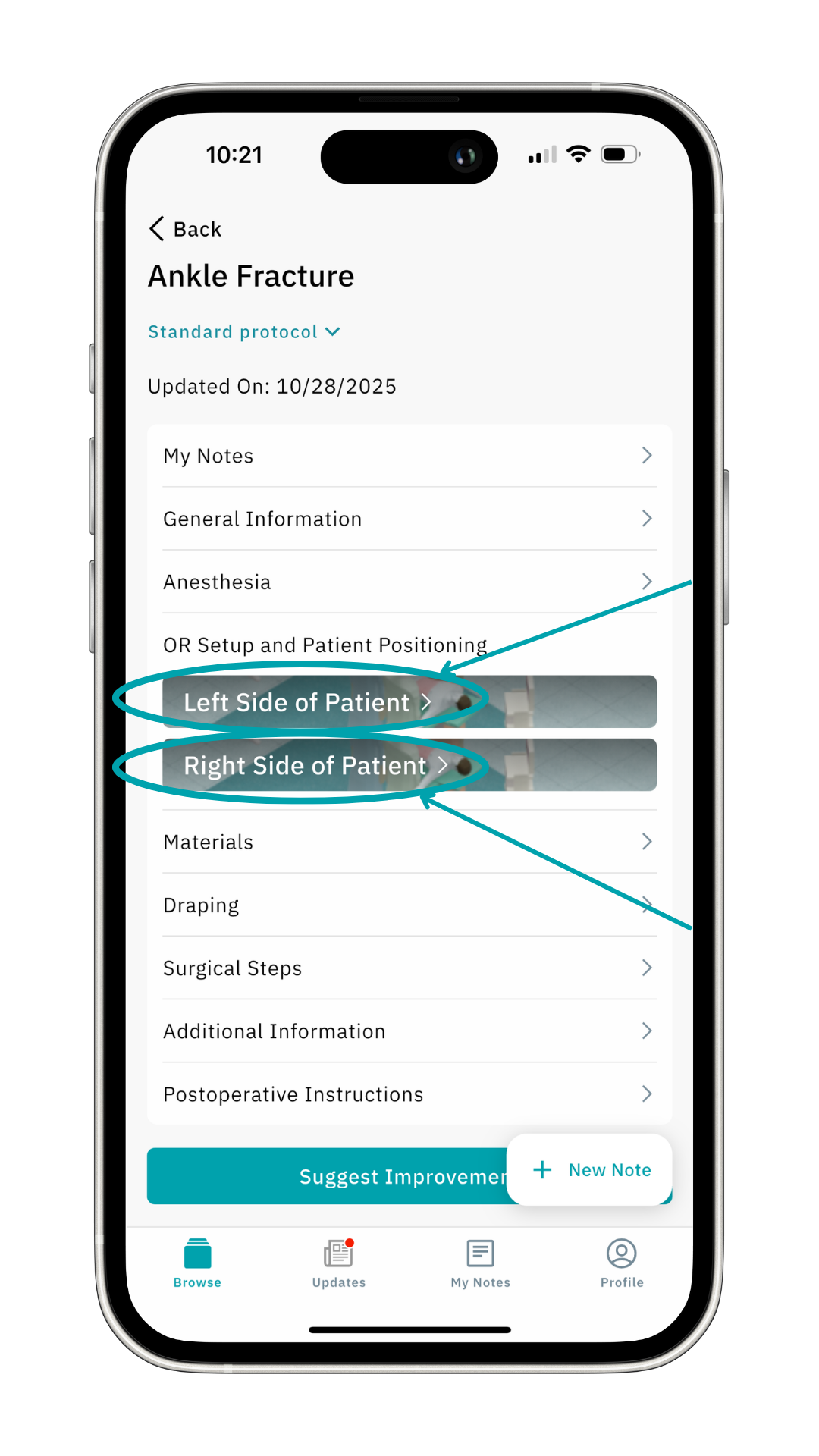 If available, select the left or right side version of the protocol to see further details. Scroll down for details of patient positioning.
