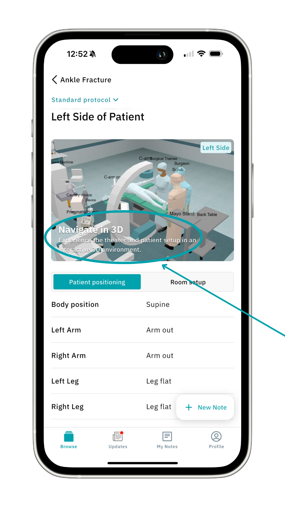 Click Navigate in 3D to experience the operating room and patient setup in an interactive 3D environment.