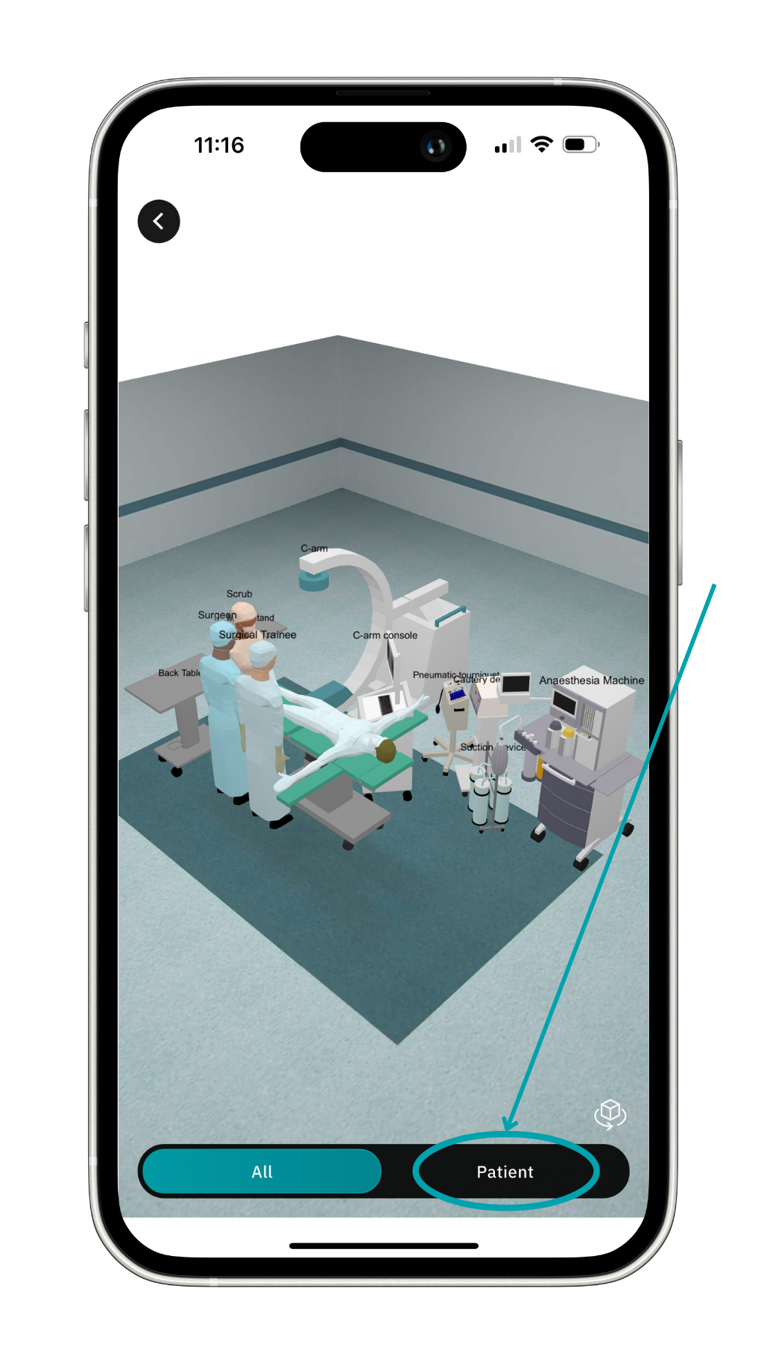 You can now see the OR setup and patient positioning in 3D specific to this procedure and surgeon. Swipe your finger to turn the 3D model as you wish. Pinch the screen to zoom in and out.