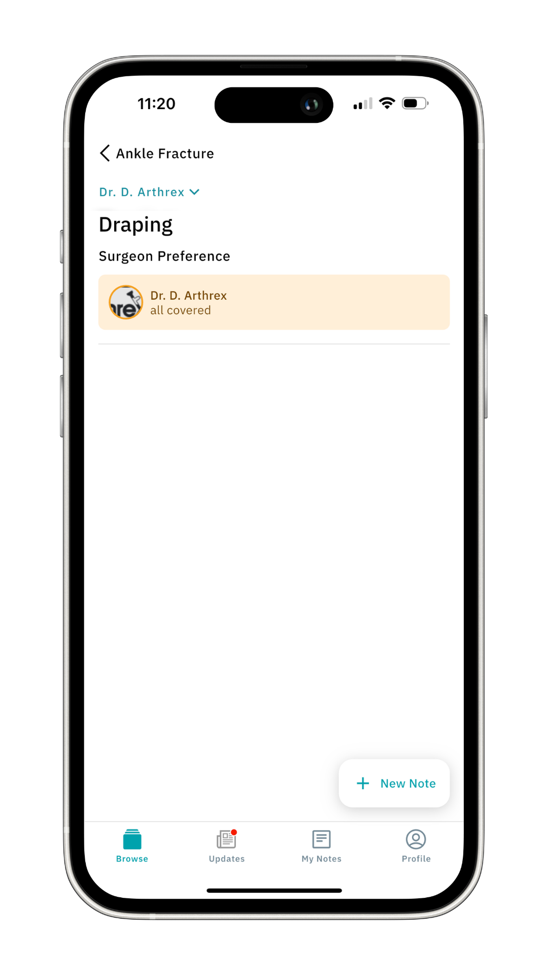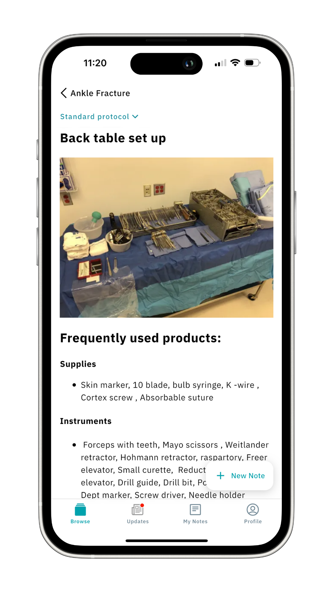 For example, let’s explore a protocol from trauma surgery. Scroll down a bit and click Trauma Surgery, then click on the Ankle Fracture Open Reduction and Internal Fixation protocol. Here you'll find a list of surgeons performing this procedure, along with the standard protocol and the Curated by Incision section. For this example, we'll click on Dr. T. Graham.