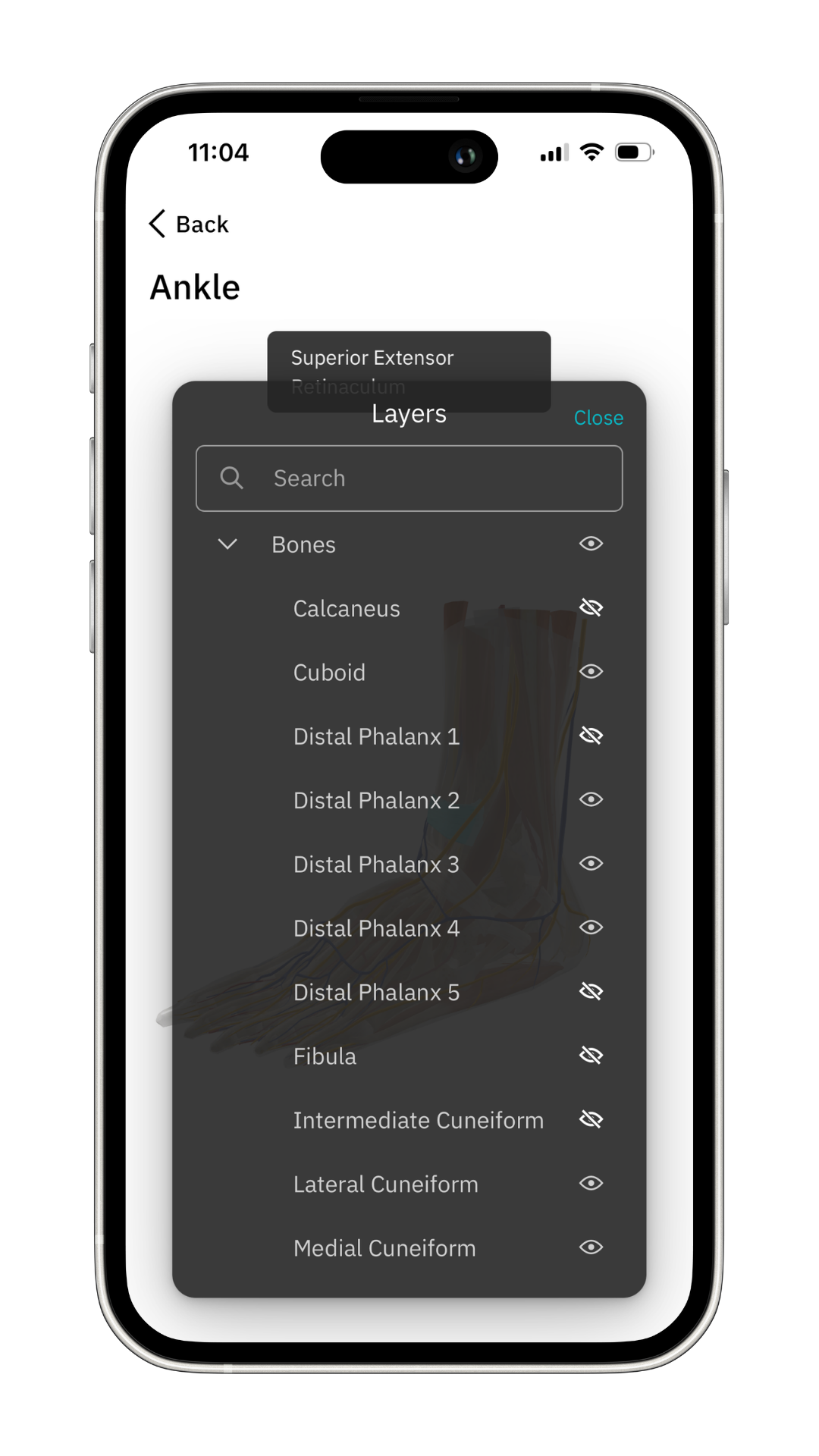 • Do you only want to see one specific item? Make sure all other items are hidden. Click 'Close' to see the 3D anatomy model.