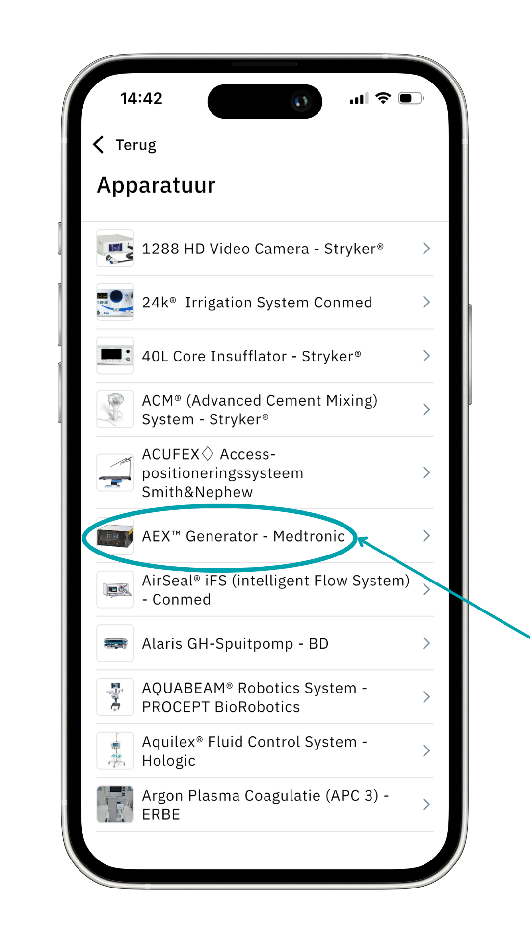 Je vindt de apparatuur onder de specialismes. Je kunt door de lijst scrollen of een de hele lijst zien door op ‘apparatuur’ te klikken.