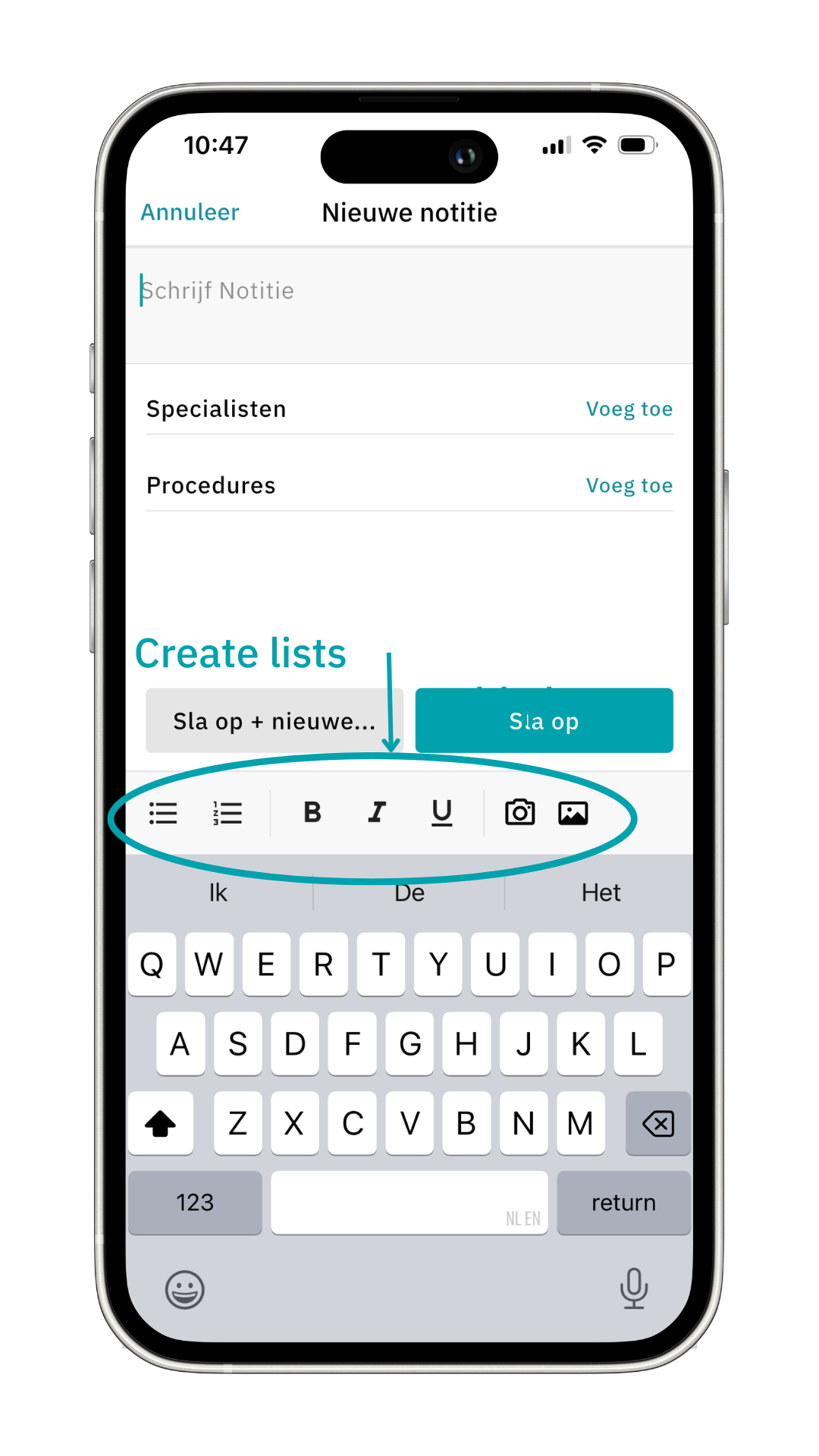 Je kunt nu je notitie typen. Boven het toetsenbord zie je handige opmaakopties, zo kun je bullet points toevoegen, de tekst dikgedrukt maken, of afbeeldingen toevoegen.
