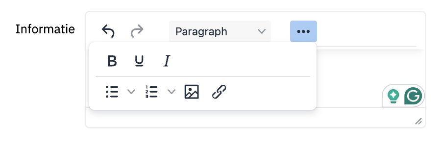 Gebruik de 3 puntjes om een tekst dik gedrukt, onderstreept of schuin te maken. Ook kun je bullet points toevoegen, of een link en/of plaatjes invoegen.