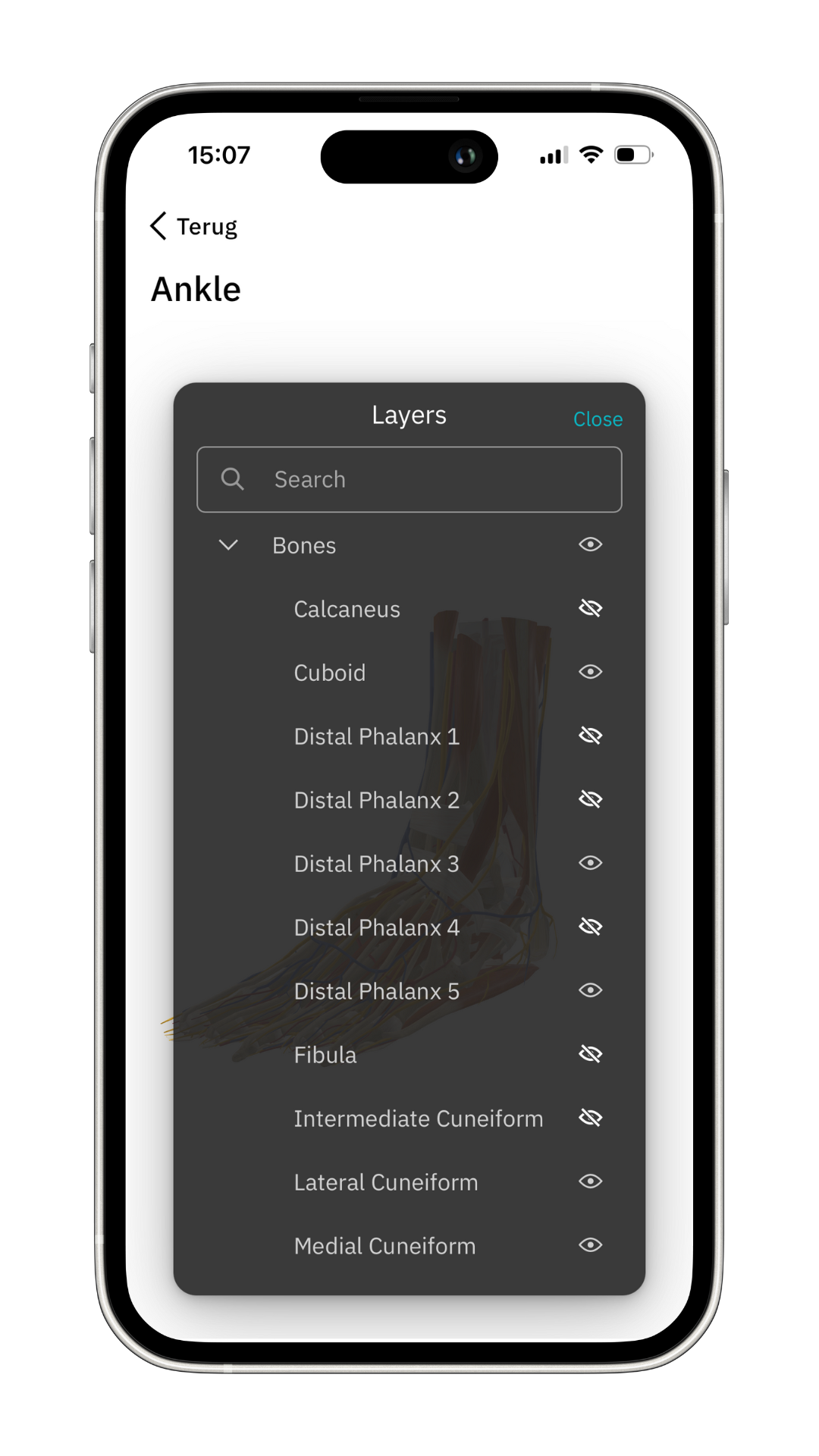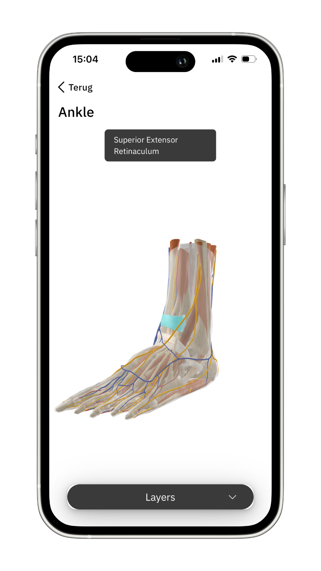 Als voorbeeld kijken we naar het 3D model van de enkel. Klik op ‘Ankle’